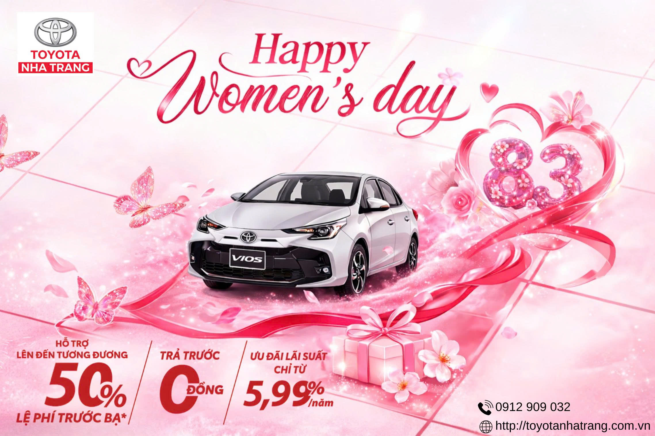 Nhân dịp Ngày Quốc Tế Phụ Nữ 8/3, Toyota Nha Trang gửi đến Quý khách hàng chương trình ưu đãi hấp dẫn khi sở hữu Toyota Vios – mẫu sedan quốc dân bền bỉ, tiết kiệm và phù hợp cho mọi gia đình.